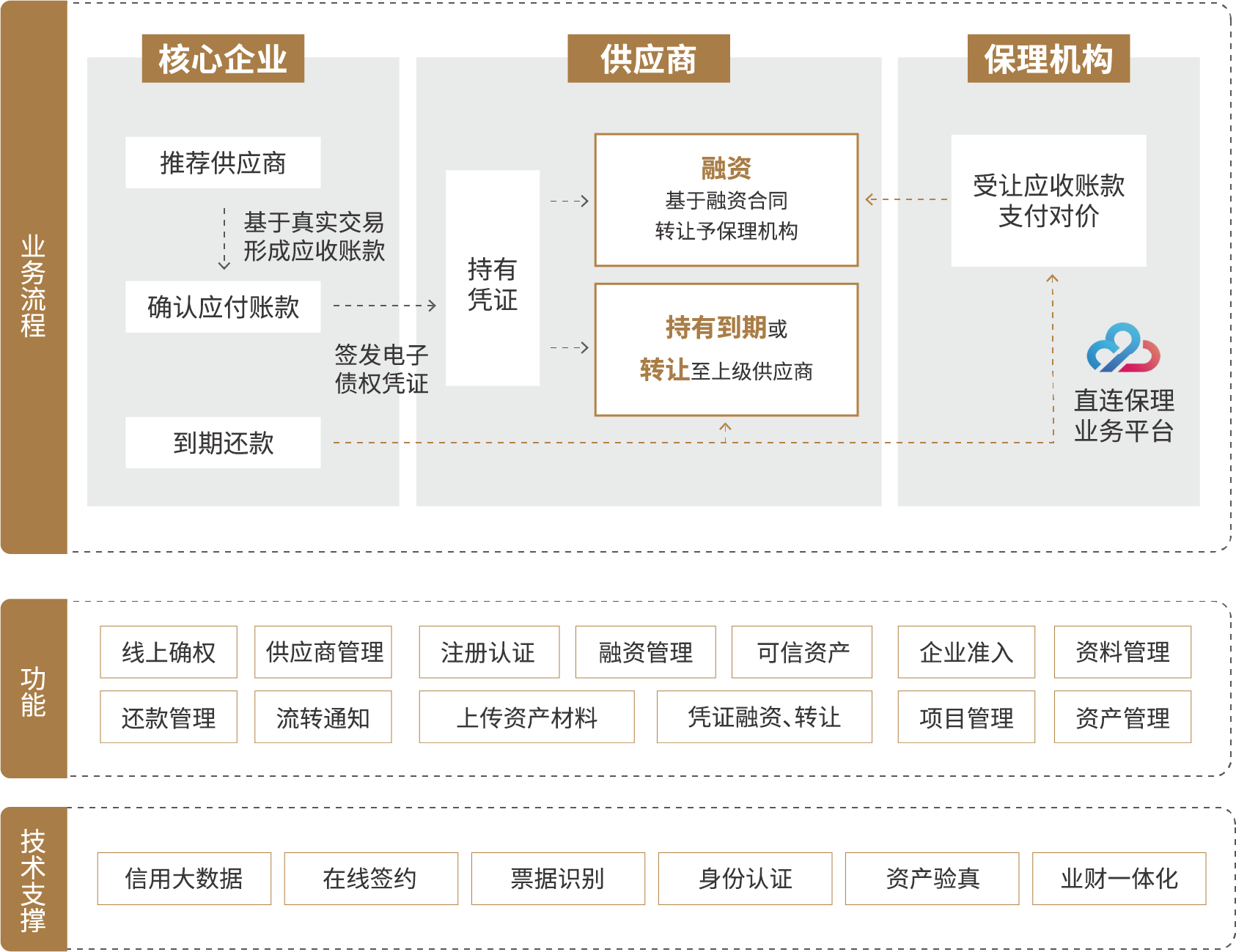 - 实现产融协同打通供应链与资金端之间的通道,为供应链全链条提供金融支持。为企业提供了灵活高效的融资解决方案,助力企业快速回笼资金,提高资金周转率。同时,为保理公司提供优质、可信资产,提高保理公司业务拓展能力。