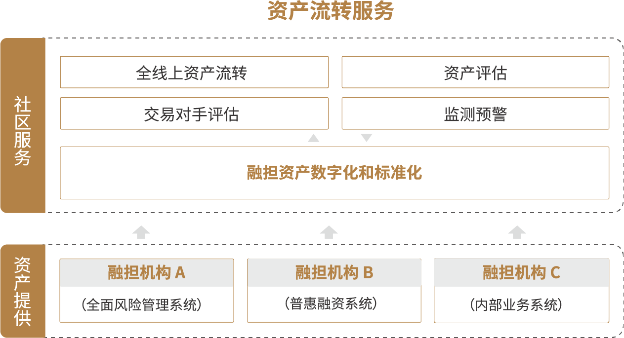 - 针对融担资产与交易对手的专业评估提供专业的资产评估报告和融担机构评估报告,为交易双方准确把握流转资产风险和交易对手风险提供支持。同时还引入中证鹏元等专业评级机构,可为交易双方提供定制化的风险评估服务。