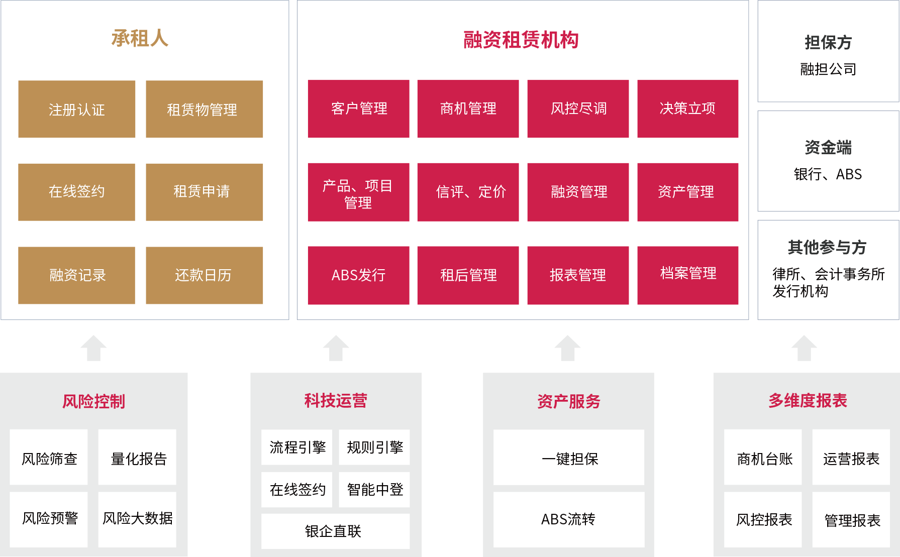- 科技化的运营支持租赁云针对租赁业务运营特点,内置丰富的运营辅助工具,包括发票OCR、发票验真、在线签约、智能中登、商票反欺诈、智能银企、身份证OCR、人脸识别等自动化运营功能,将这些功能嵌入业务过程中,大大提高运营工作效率,降低操作风险及运营成本,并建立全面的资产台账和全生命周期管理,确保租赁物和押品的全程监控和有效管理。